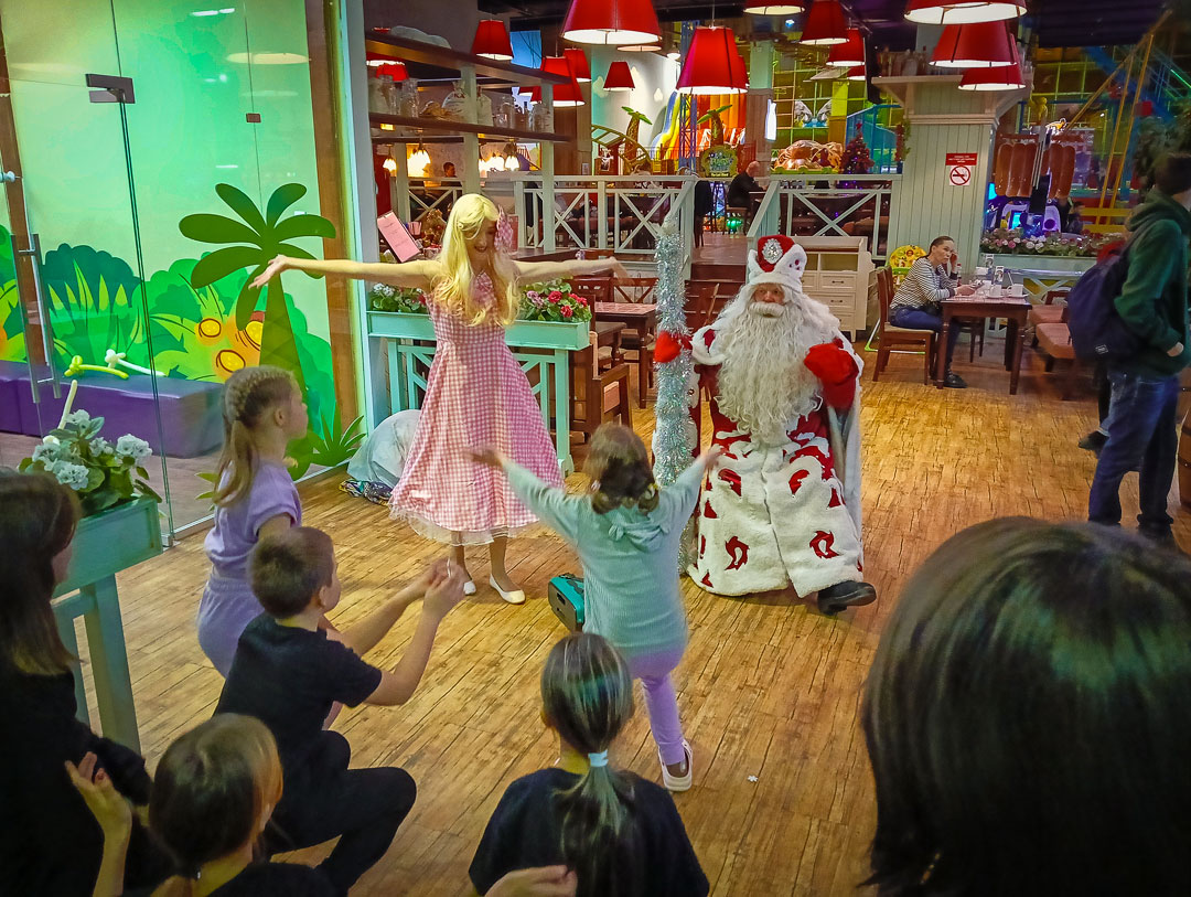 Вечером посетили игровой центр “Мегалэнд”, где для ребят была подготовлена праздничная программа. Дед Мороз и кукла Барби провели анимацию, различные конкурсы, дети посетили батутный центр, лабиринт, покатались на атракционе ” Веселая горка”.